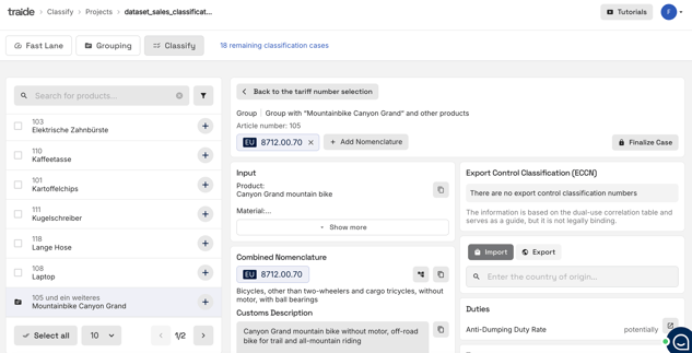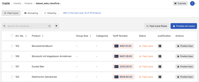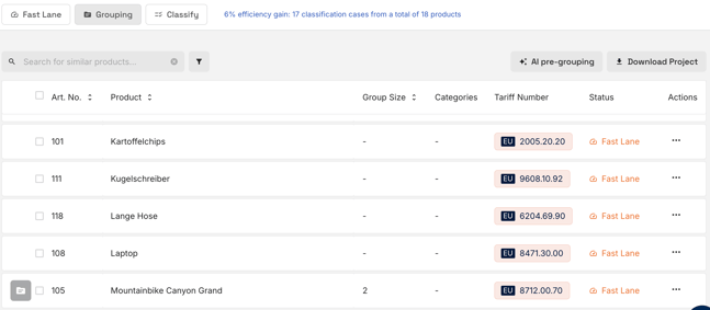 Now click on the project to access the product list and the option to use different views or filters. The goal is for each product to have an appropriate tariff number assigned. There are various features to support you during classification. In the top left corner, you’ll find the views: Fast Lane, Group, and Classify.