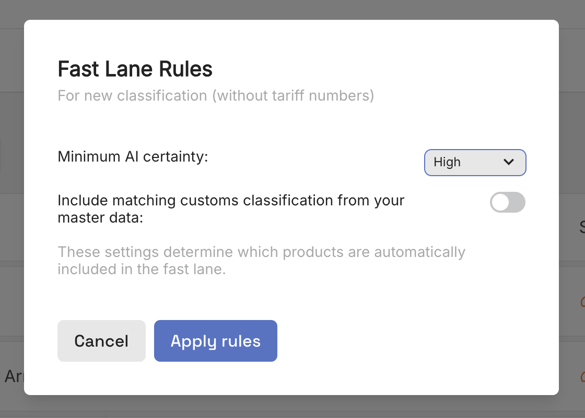 Under the Fast Lane rules, you can define the desired confidence level. This means that the better the data quality, the higher the AI's reliability. Master data can also be included, so the AI checks whether a similar product has already been classified.