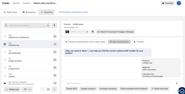 Products that are still left, or if you prefer to do it this way, can also be classified manually. On the left, you see a list of all products to be classified, and on the right, you have the option to either match the case with existing master data or classify it anew. This view will already be familiar from manual product entry. In the chat with the AI "Alice", you can review the AI’s reasoning or adjust the proposed tariff number. Additionally, you can access more context or even search the internet for product images.