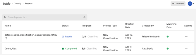 You can either upload a new classification project to classify a product list in traide, or you can upload a review project, which allows you to compare your classification decisions with those of the AI.