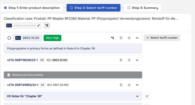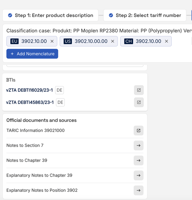 Every decision made by the AI is transparent due to the detailed and granular process when a tariff number is suggested. Additionally, traide lists every source, such as the TARIC, referenced documents, notes, and BTIs that justify the decision. All European BTIs are considered in this process.