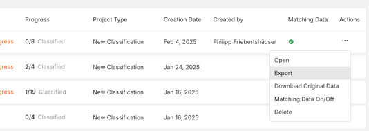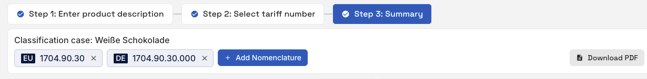 You can export your initial Excel file at any time. With the extended Excel export, you’ll receive your original file again, along with an additional column containing the information about the selected tariff number. This file can also be printed at any time.