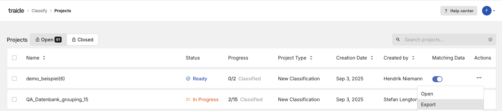 For mass classification/projects, there is a permanent link that is listed in the Excel export. This link always leads to the classified product in traide. This means that after closing the cases, you can export the Excel file and then import it back into your ERP system, where the URL link is stored.