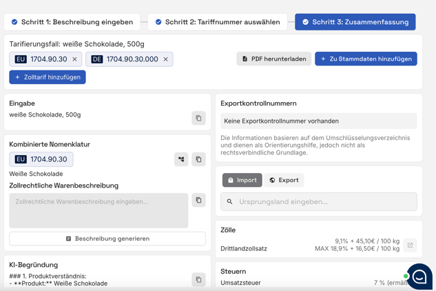 In der Zusammenfassung folgt auf der linken Seite eine Übersicht aller relevanten Informationen, die du zur Verfügung gestellt hast und die für die Entscheidung der KI von Relevanz waren. Auf der rechten Seite erhältst du einen Ausblick an Implikationen, die für den Import bzw. Export von Relevanz sein könnten.