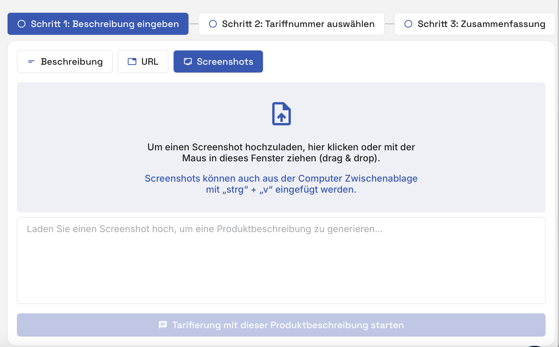 Verwende Screenshots, URL oder eine manuell erstellte Produktbeschreibung für die Tarifierung